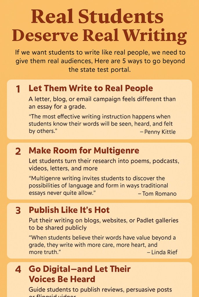 Give them a platform. Let them write reviews, record podcasts, or write persuasive posts. They’re already content creators—we just need to teach them how to do it with craft, clarity, and purpose.